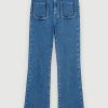 بنطلون جينز عالي الخصر باللون الأزرق الباهت قليلاً، ومثبت بأربعة أزرار كبيرة. طراز واسع وجيوب أمامية كبيرة.