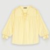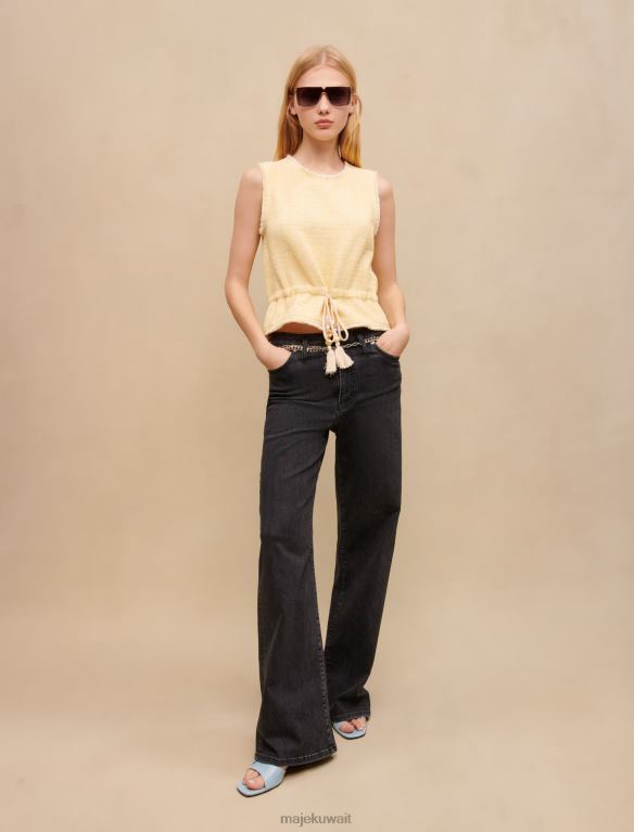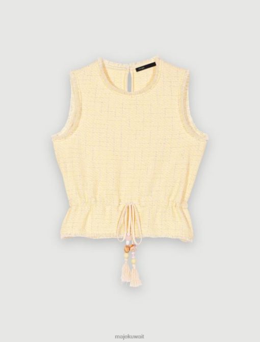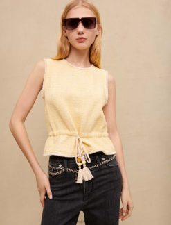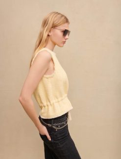 هذه البلوزة من التويد بدون أكمام، باللون الأصفر الباستيل مع خيط من اللوريكس الفضي، مشدودة عند الخصر برباط سحب مزين بالأحجار والخرز. فهو مثالي ليوم واحد في المكتب.