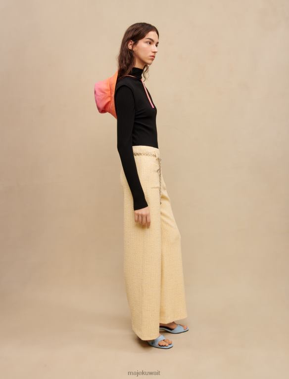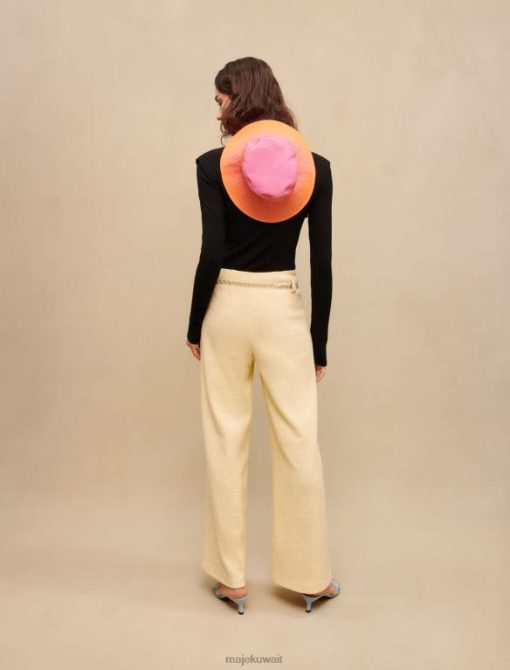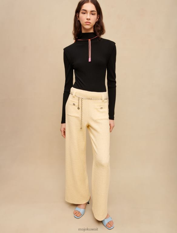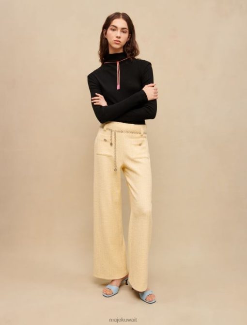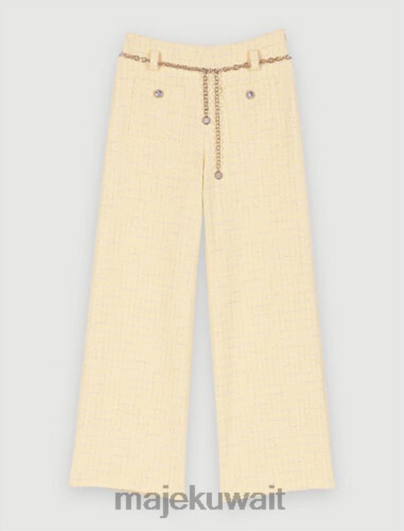 تم تعزيز هذا البنطلون التويد باللون الأصفر الفاتح بخيوط اللوريكس الفضية. لديهم حزام سلسلة Maje Clover باللون الفضي. ويضمن مقاسها الفضفاض مظهرًا أنيقًا وعصريًا.