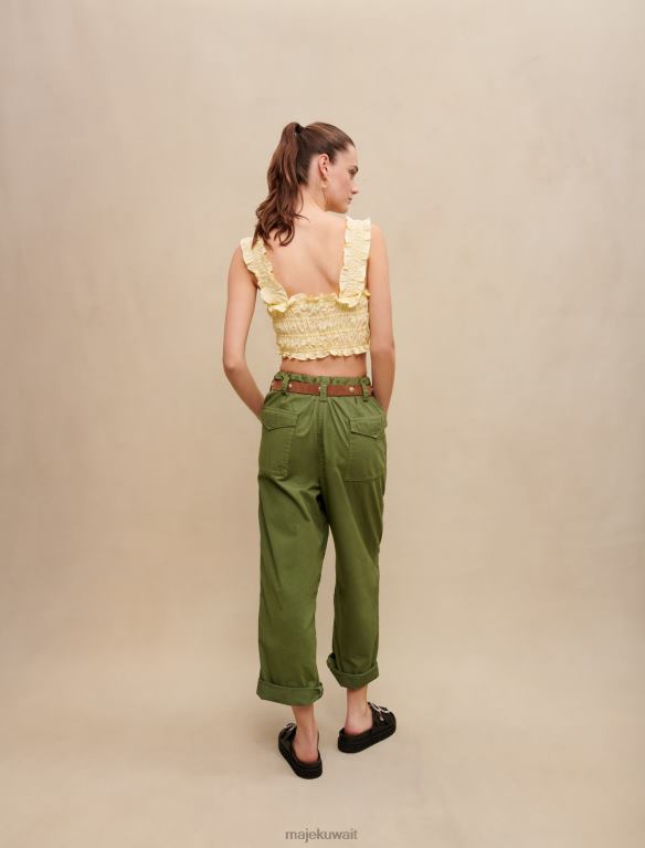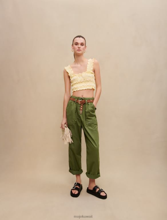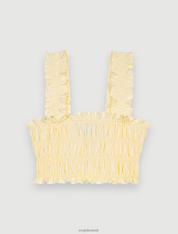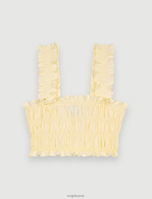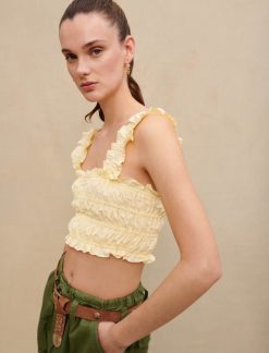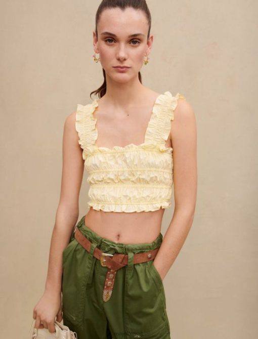 يعد هذا القميص القصير ذو النسيج المزخرف إضافة أنيقة لخزانة ملابسك الصيفية. مع خط رقبة مربع، ويتميز بأشرطة واسعة وصدرية مزخرفة مزين بالكشاكش والكشكشة للحصول على مظهر خفيف الوزن وملفت.