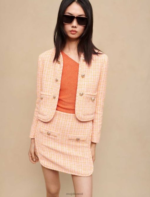 الصيف في Maje يأتي بألوان الباستيل. تمت إعادة النظر في تنورة التويد الأساسية بظلال ناعمة تضفي الخفة على خزانة ملابس العمل. هذه التنورة القصيرة ذات القصة المستقيمة مع خصر متوسط الارتفاع مصنوعة من قماش بتأثير التويد. إنه مزين بجيبين زائفين مع أزرار مزخرفة باللون الذهبي وله ألواح على الجوانب تتلاعب بالطول. للحصول على صورة ظلية أنيقة، اختاري المظهر الكامل وارتديه مع السترة المطابقة. للحصول على مظهر أكثر كاجوال، ما عليك سوى اختيار تي شيرت أبيض.