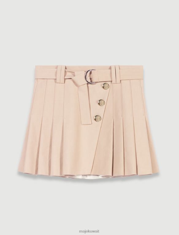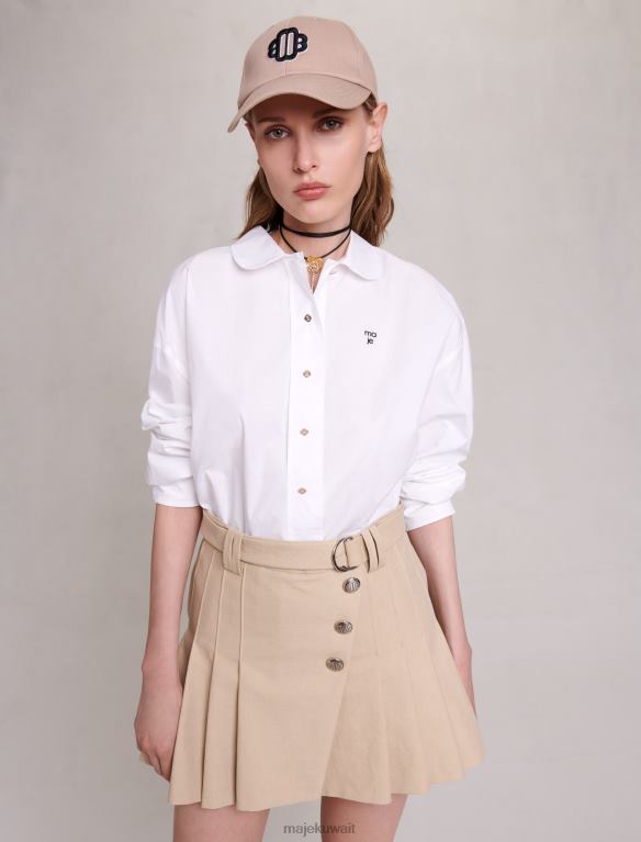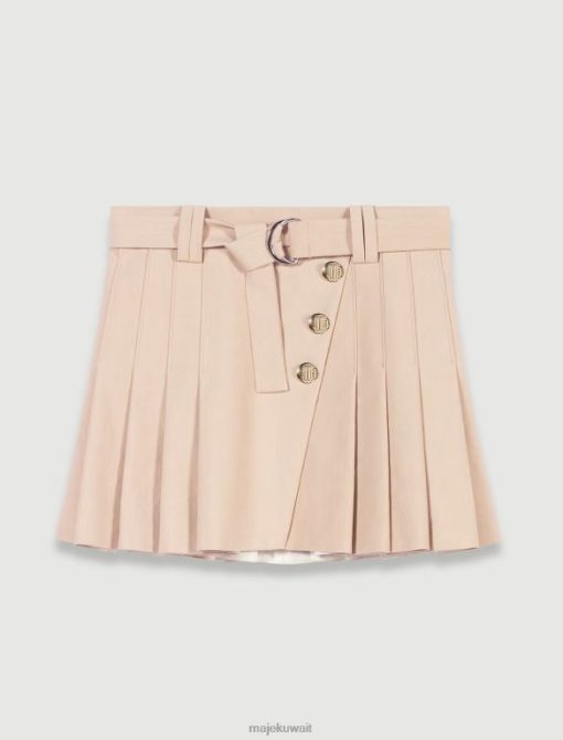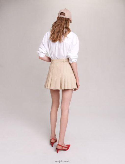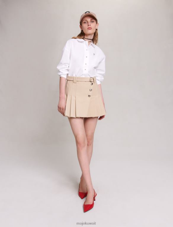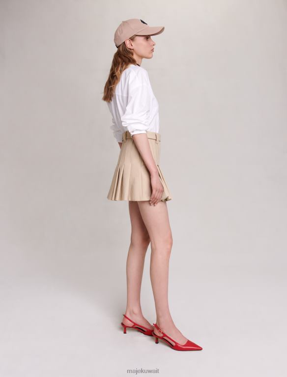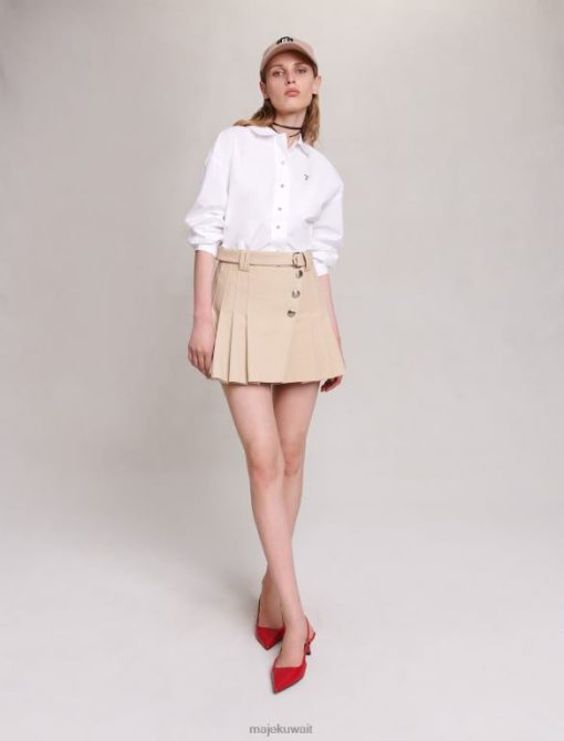 مستوحاة من مظهر تلميذة المدرسة، تتميز هذه التنورة القصيرة ذات الكسرات والواسعة قليلاً بأزرار فضية اللون على الجوانب وحزام قابل للفصل مع إبزيم قابل للتعديل عند الخصر. يتميز بحلقات للحزام، ويمكن أيضًا ارتداؤه مع حزام جلدي لتغيير مظهرك، كما أنه مزود بسحاب للإغلاق في الخلف بالإضافة إلى جيبين جانبيين. يمكنك اللعب بالحجم من خلال تنسيقه مع قميص قطني فضفاض وإضافة المزيد بعض الملحقات المختارة، مثل الكعب الملون والقبعة المميزة.
