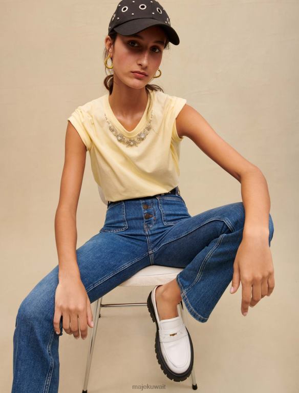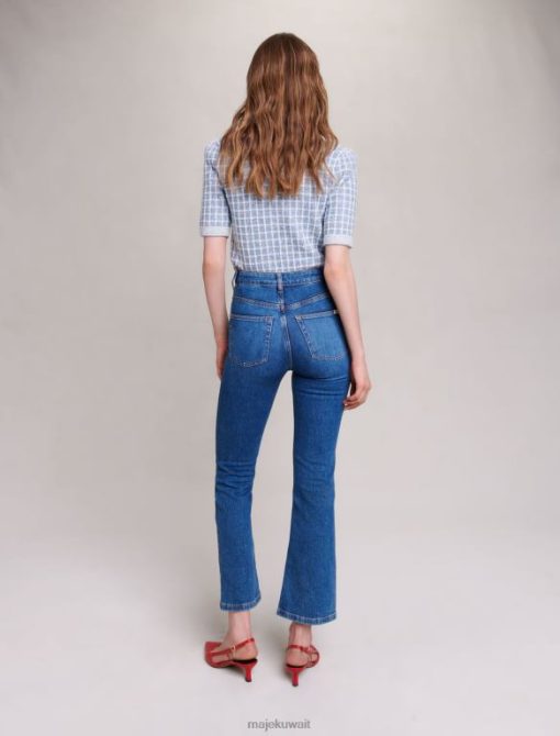 جينز متوسط الارتفاع مع توهج طفيف في الساق وممزق قليلاً من الأسفل. قماش الدنيم القطني المطاطي الباهت قليلاً والصديق للبيئة. جيبان أماميان، وجيب صغير للتذاكر، وجيبان خلفيان. زر وسحاب في الأمام. علامة maje على حزام الخصر في الخلف.