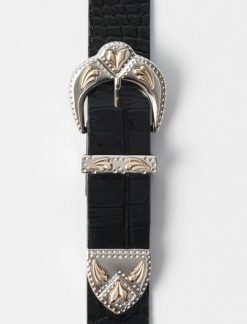 حزام من الجلد المنقوش بتأثير جلد التمساح على الطراز الغربي مع إبزيمين قابلين للتعديل. أبازيم فضية اللون مع تفاصيل ذهبية اللون. 3 فتحات للتعديل لكل مشبك. العرض: 2.8 سم.