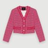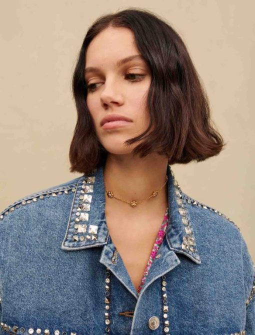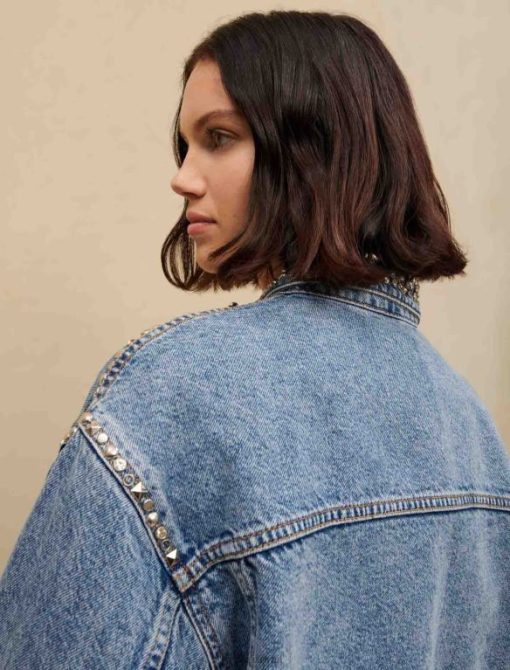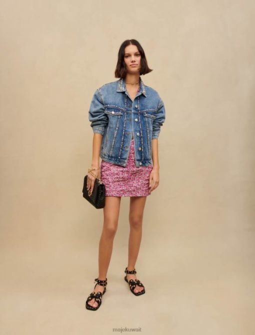 Maje سترة الدنيم مع أحجار الراين ملابس أزرق فاتح نحيف JP08B328