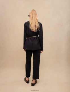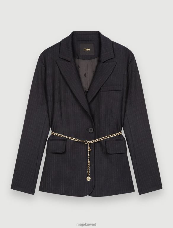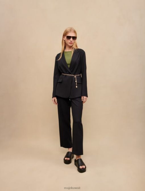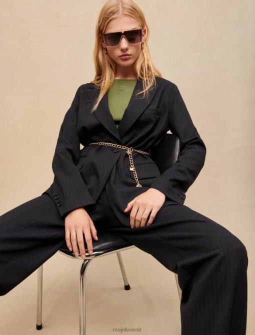 سترة مزدوجة الصدر بقصة مستقيمة وواسعة، مصنوعة من بدلة قابلة للتمدد قليلاً. خطوط الطباشير المتناقضة. أكمام طويلة ومستقيمة. بطانة جاكار فيسكوز سوداء من Maje. أزرار تحمل العلامة التجارية Maje على الأطراف الأمامية والأكمام. جيوب بقلاب في الأمام وجيب بسحاب على الصدر. حزام سلسلة قابل للتعديل وقابل للإزالة مع خرز منسدل. يمكن ارتداؤه مع بنطال بيلينا.