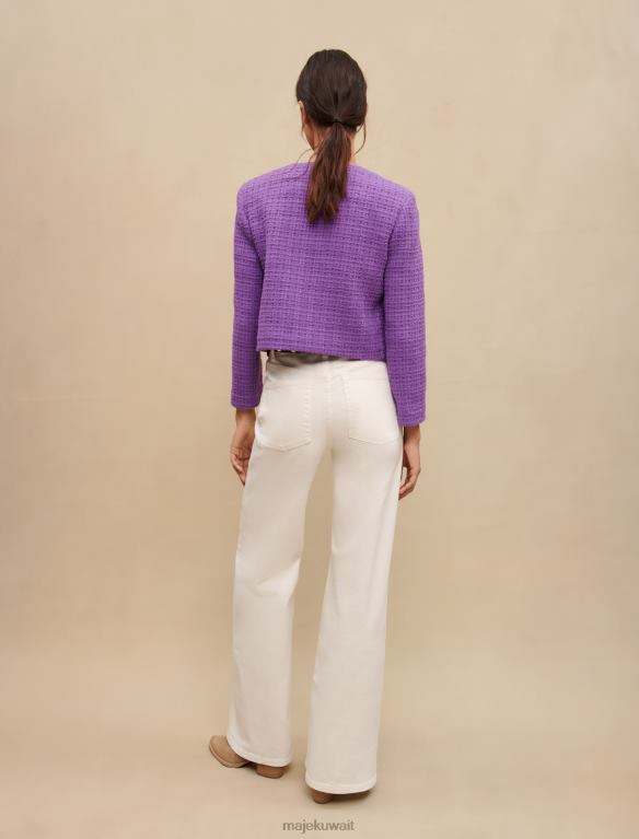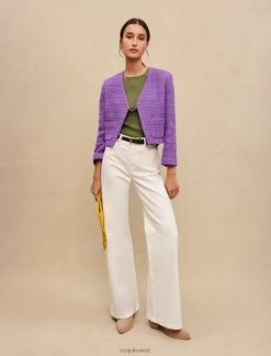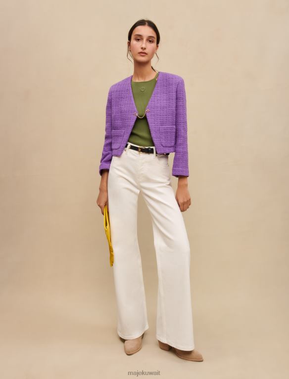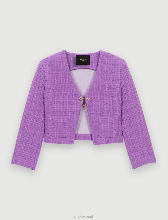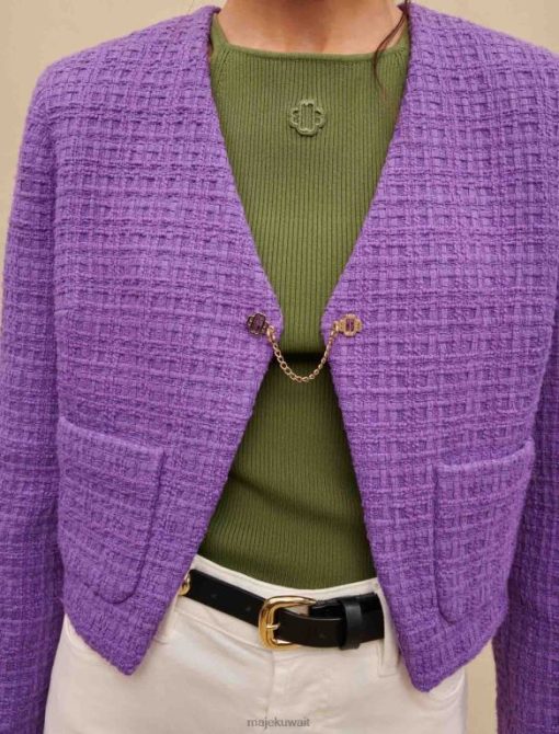 في هذا الموسم، قمنا بتجديد سترة التويد الأنيقة والمهيكلة لتصبح قصة قصيرة ومجهزة بسلسلة من البرسيم للتثبيت.