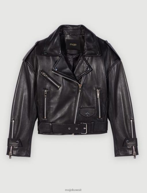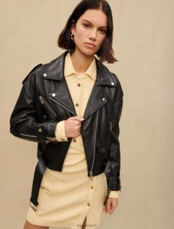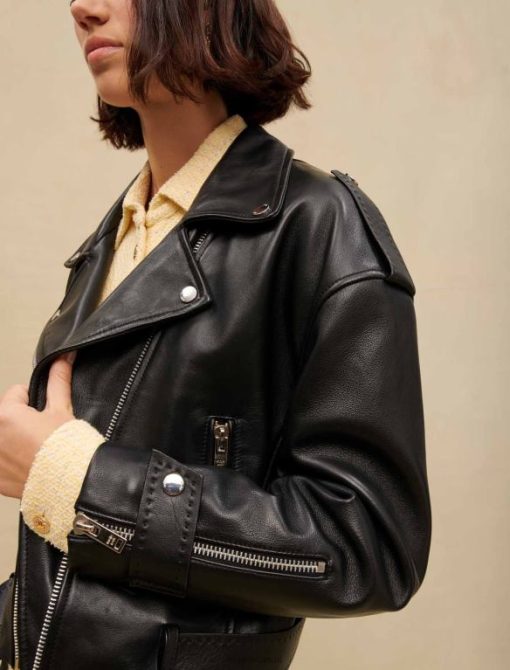 تعيد هذه السترة النظر إلى سترة راكبي الدراجات النارية المثالية بقصة كبيرة الحجم وجلد ناعم. الأكمام طويلة وفضفاضة. السترة مبطنة بالكامل. الياقة والحزام قابلان للإزالة. مثالي لأي مناسبة.