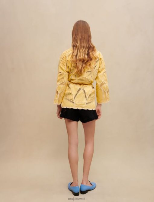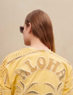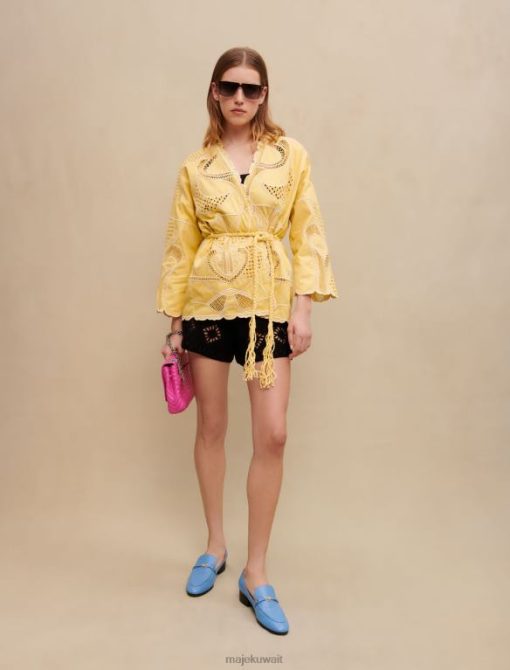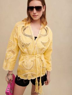 واحدة من القطع التي لا غنى عنها لهذا الموسم، سترة الكيمونو هذه ذات الأكمام الطويلة مزينة بزخارف كروشيه يدوية وحواف صدفية وتتميز بحزام قابل للإزالة. يتيح تعدد استخداماته ارتدائه مفتوحًا فوق فستان خفيف الوزن أو ربطه عند الخصر فوق قميص وسروال قصير.