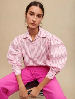 هذه السترة القصيرة ذات اللون الوردي مصنوعة من نسيج محبوك بلون الباستيل. يتميز بأربعة جيوب أمامية مع أزرار مرصعة بالجواهر. يتم تثبيته بأزرار مرصعة بالجواهر الفضية. مثالي ليوم في المكتب.