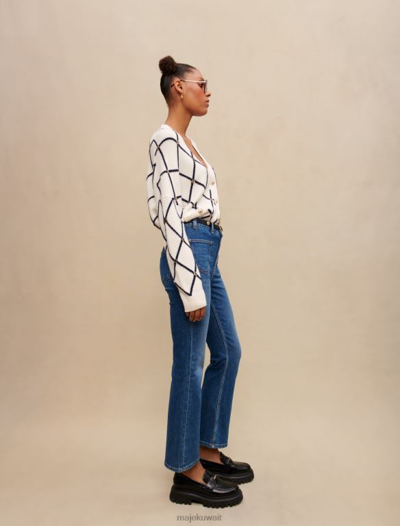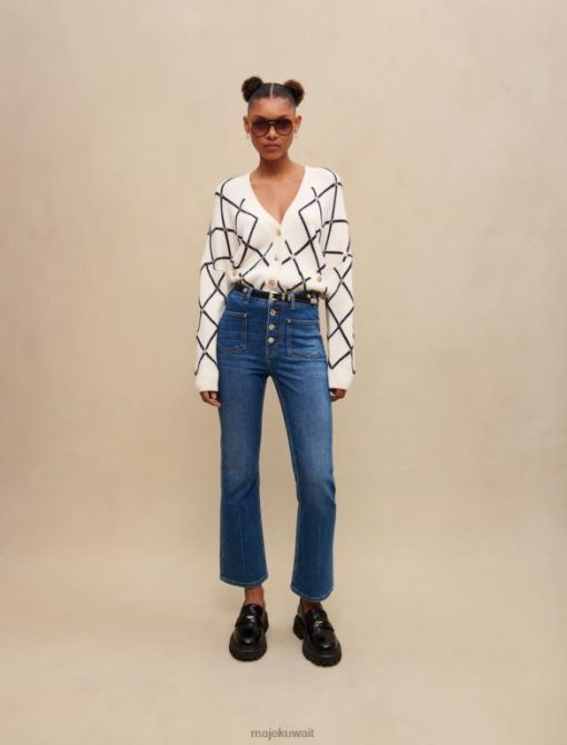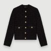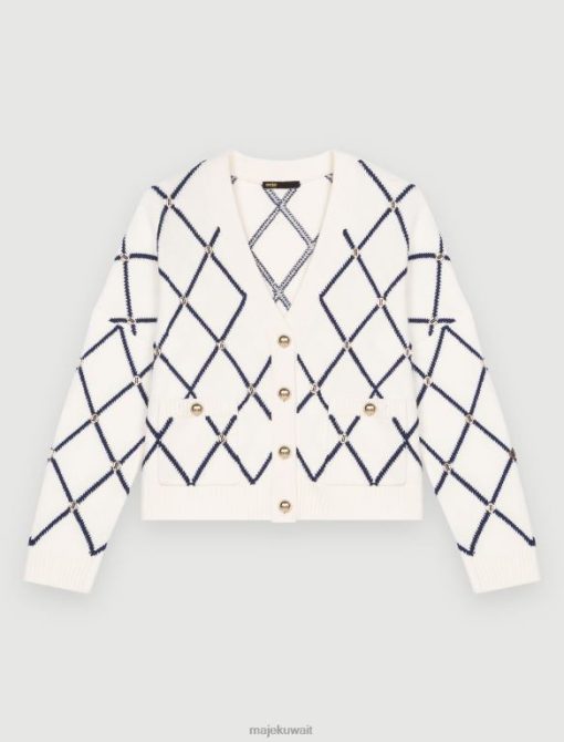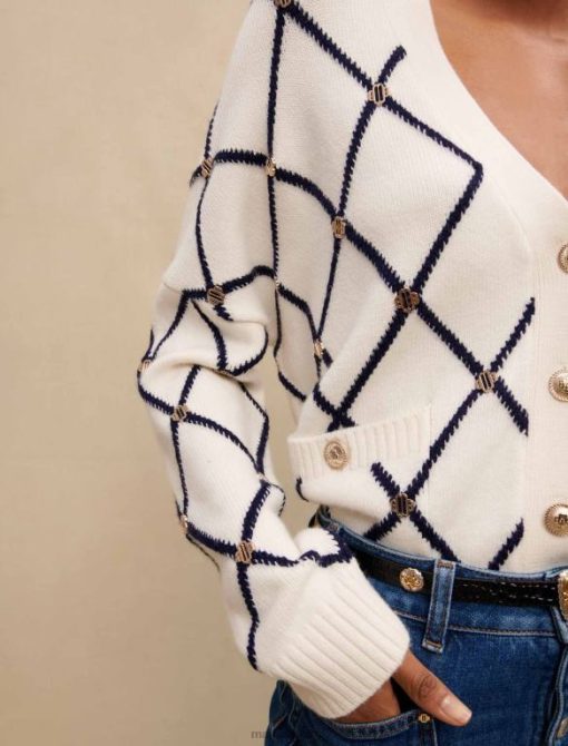 سترة جاكار متماسكة مستقيمة مع نمط الماس. أكمام طويلة ومستقيمة. خط العنق الخامس. أزرار معدنية تتميز بشعار Maje. جيوب رقعة ومسامير معدنية من نوع Maje Clover. يمكن ارتداؤه مع بنطال جينز بامورجوس.