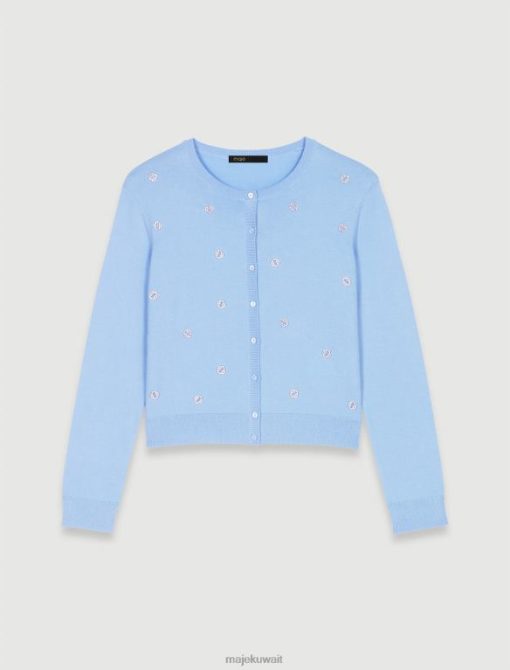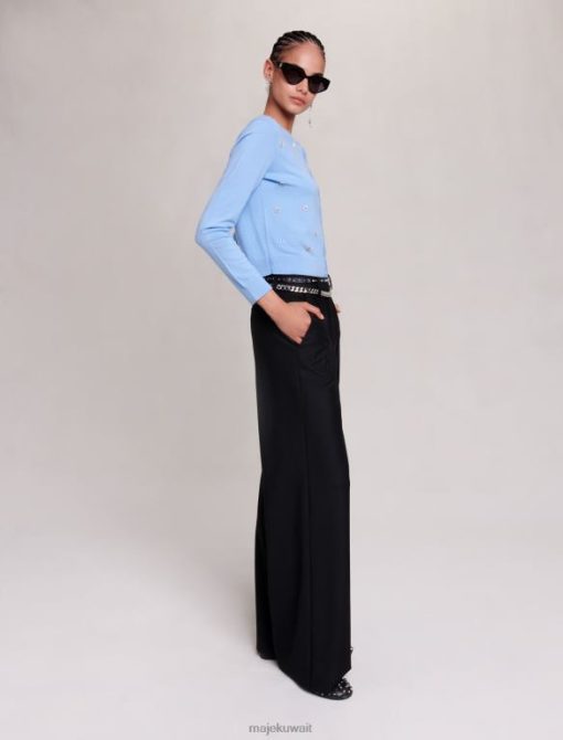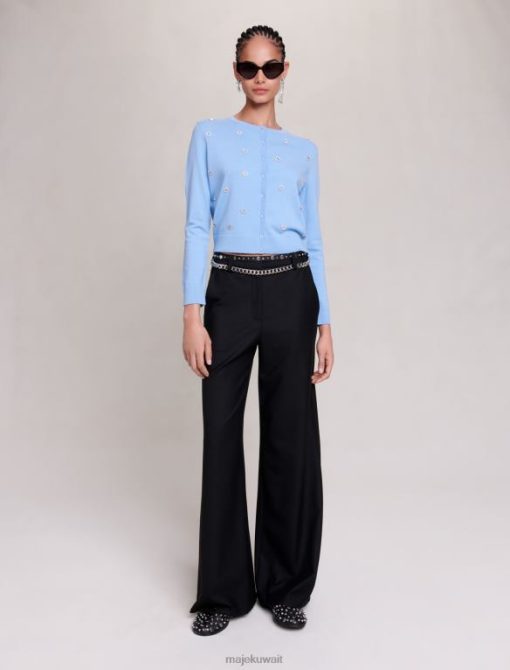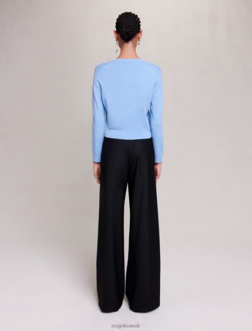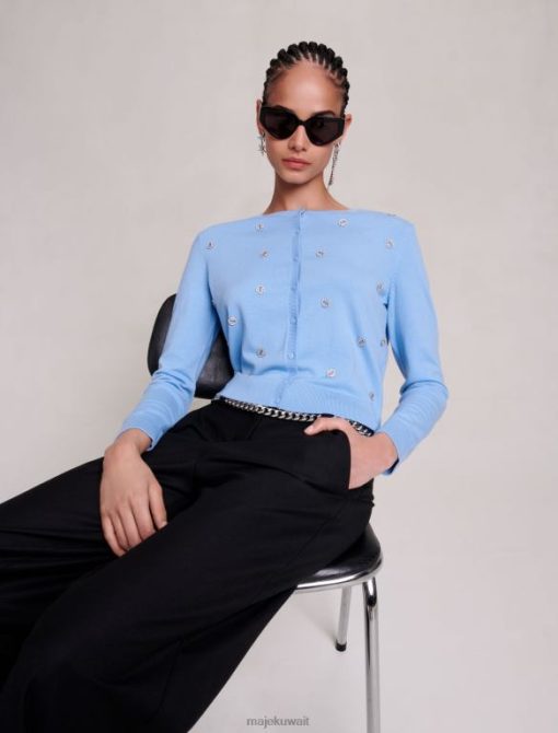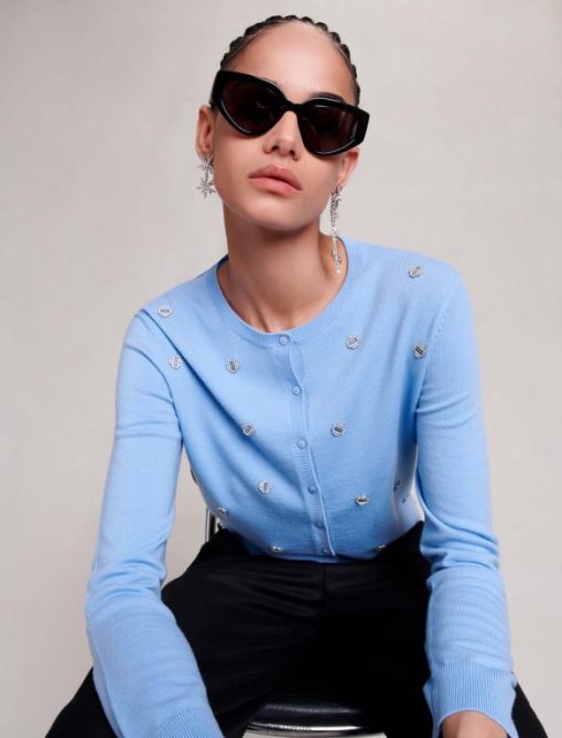 تتميز هذه السترة ذات الحياكة الجميلة ببرسيم Maje المميز. مصنوعة من مزيج صوف ميرينو، وتتميز هذه السترة المستقيمة القصيرة بأكمام طويلة وزر للإغلاق مع أحجار الراين على شكل البرسيم في الأمام. مع رقبة مستديرة وأساور وخصر مضلعين، يمكن ارتداؤه مع قطعة علوية متطابقة لإنشاء مجموعة أنيقة وراقية، أو مع بنطلون أسود واسع الساق لتفاعل جذاب بين الأشكال. أما بالنسبة للأكسسوارات، فأضيفي حزاماً معدنياً على الخصر وأحذية مرصعة لتعزيز الإلهام الصخري.