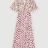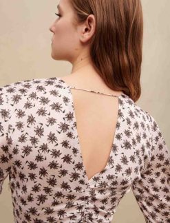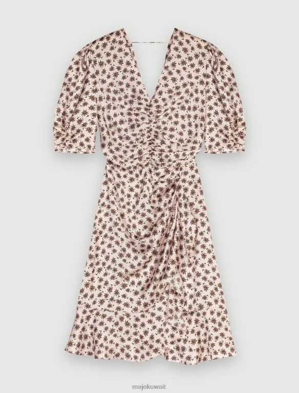 يتميز هذا الفستان بطبعة شجرة النخيل بالثنيات والكشكشة والتفاصيل الأنثوية التي لا نهاية لها. يتميز بياقة على شكل حرف V وأكمام قصيرة منتفخة ومادة حريرية رقيقة.