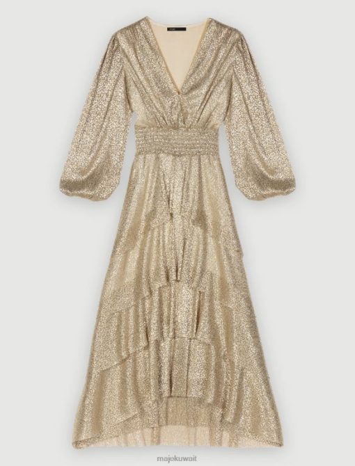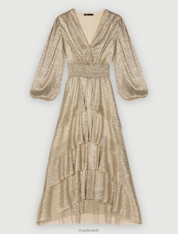 للاحتفال بقدوم الربيع والأيام الجميلة، تتخيل ماجي مجموعة من الفساتين الملونة والأنيقة والرومانسية. يتميز هذا الفستان الطويل بكشكشة رقيقة عند الخصر، مع ياقة على شكل حرف V وأكمام طويلة ضيقة، ويكشف عن تنورة مكشكشة معززة بمادة لامعة ومعدنية. تم تصميم هذه القطعة لارتدائها أثناء النهار مع زوج من الصنادل بلون الجمل، أو في الليل مع سترة فوق الأكتاف وزوج من الأحذية ذات الكعب العالي.