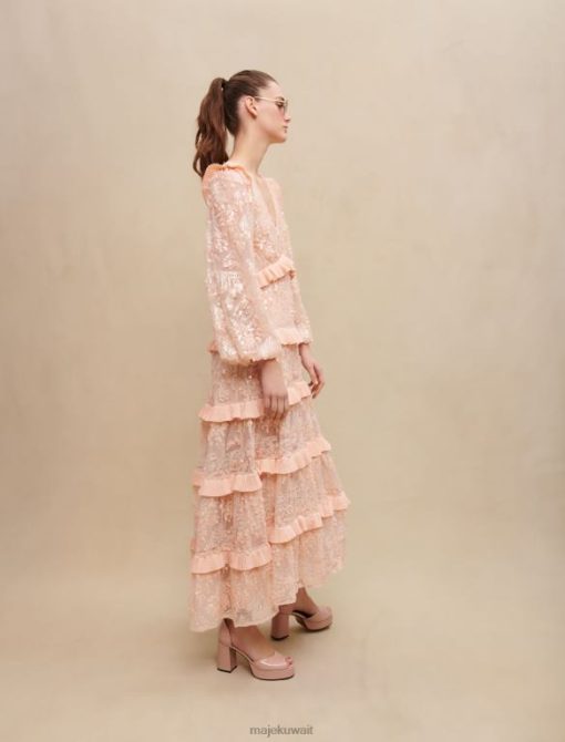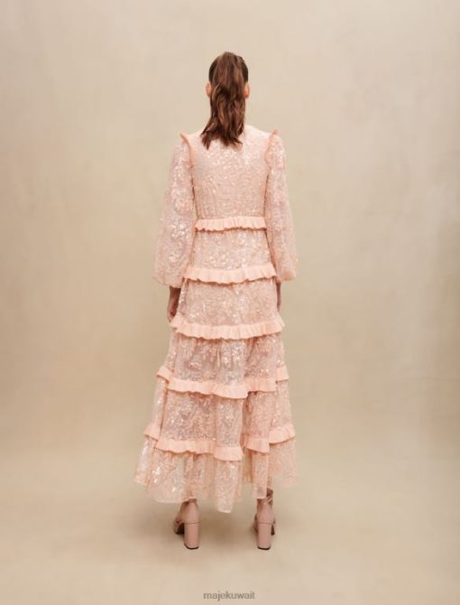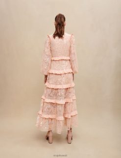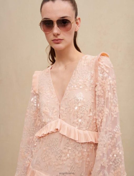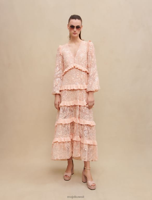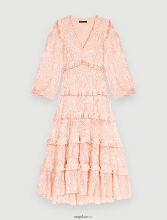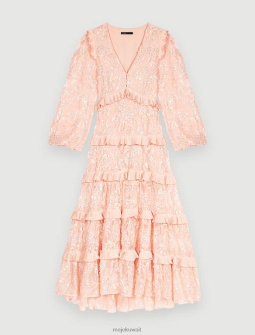 Maje فستان طويل مزين بالترتر وكشكش ملابس وردي باهت نحيف JP08B175
