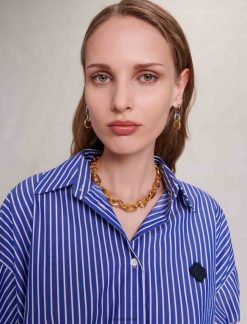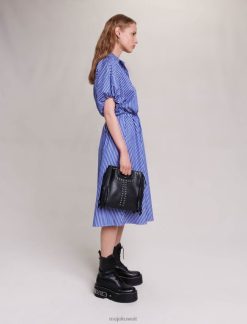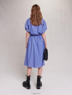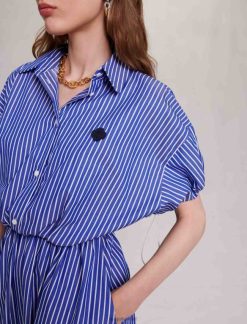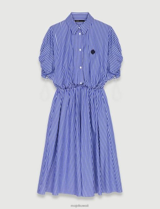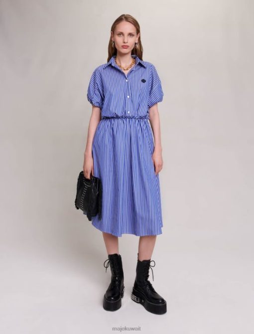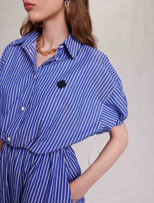 يلعب هذا الفستان القطني الطويل المزخرف بالخطوط مع الخطوط والحجم. يتميز بياقة وزر للإغلاق، وأكمام منتفخة قليلاً مع أربطة وسدادات مطاطية. مع رقعة البرسيم على الصدر، يتميز بخصر محكم وتنورة واسعة مع ثنية مثالية.
