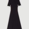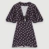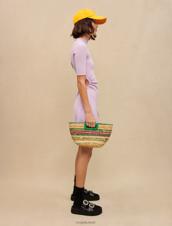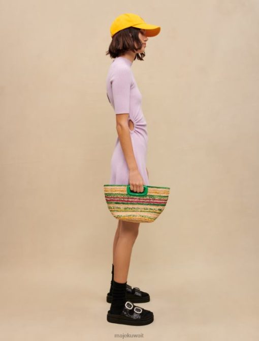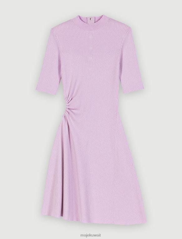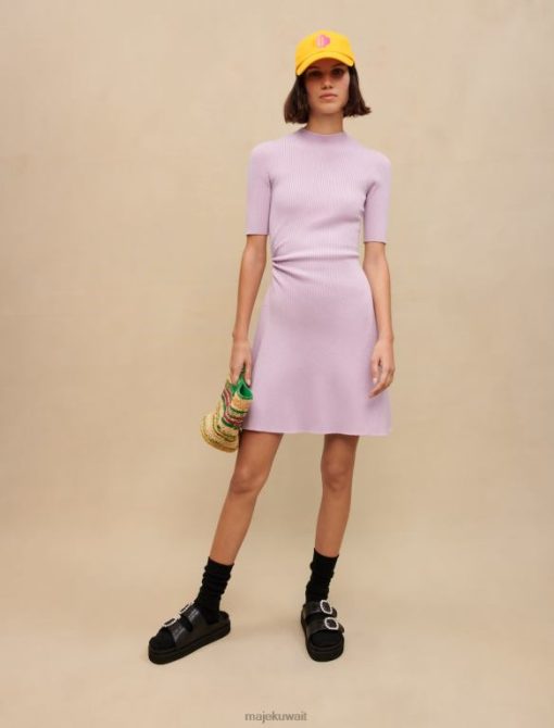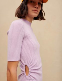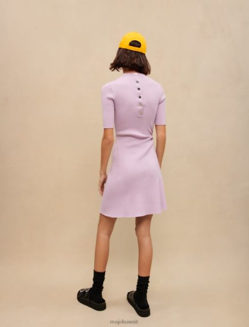 هذا الفستان المنسوج المضلع هو نسخة جديدة من الفستان القصير ذو الرقبة المستديرة. لونه بنفسجي ويتميز بفتحة دقيقة عند الخصر. توجد أزرار متناغمة على الياقة في الخلف.