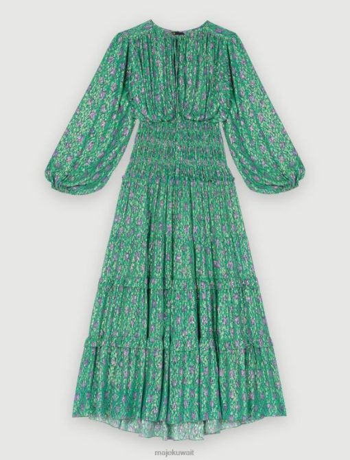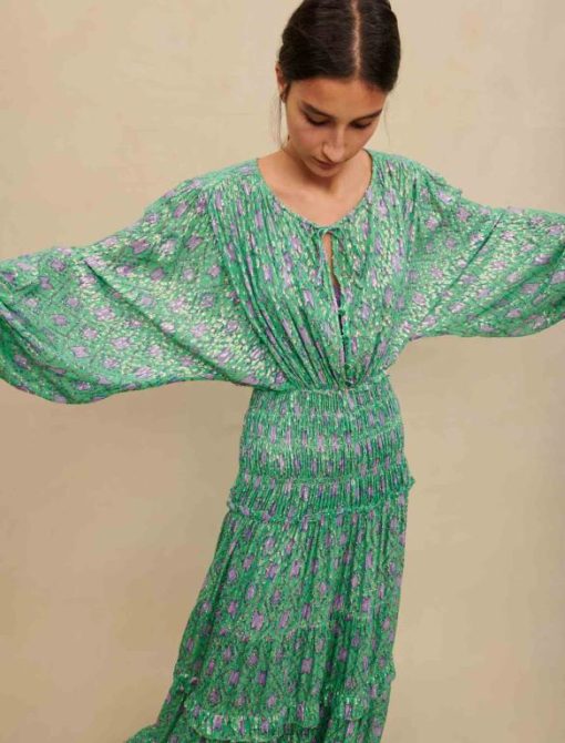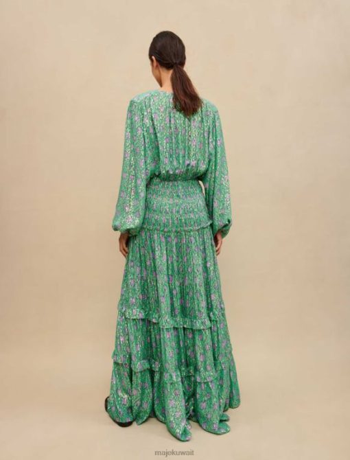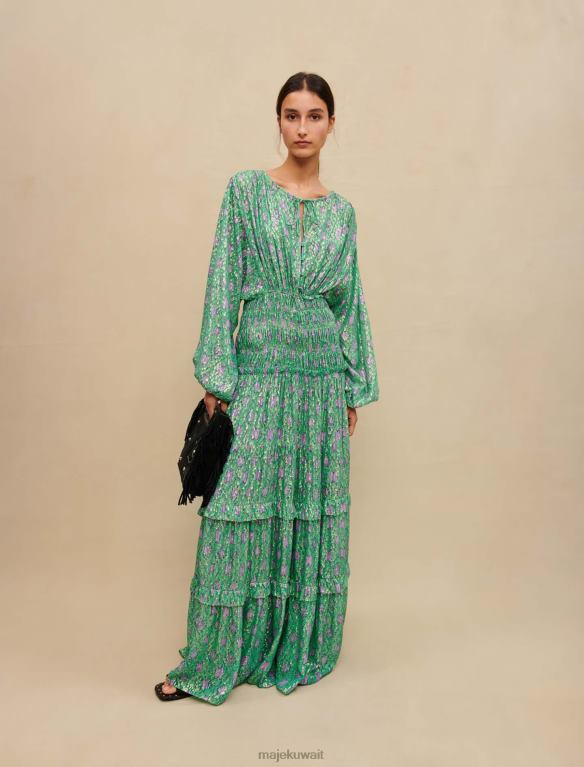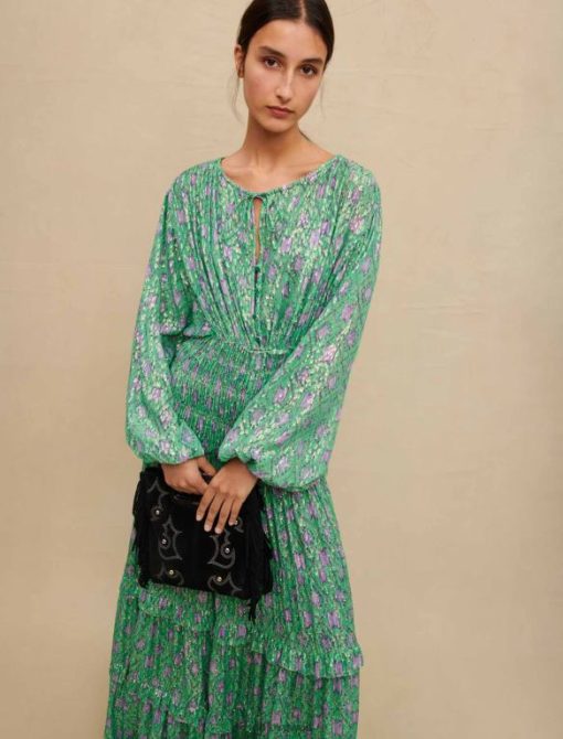 للاحتفال بقدوم الربيع والأيام الجميلة، تتخيل ماجي مجموعة من الفساتين الملونة والأنيقة والرومانسية. هذا الفستان الطويل مصنوع من مادة معدنية رقيقة ومعززة بخيوط اللوريكس اللامعة. متوفر باللونين الأخضر والأرجواني، هذا الفستان الأنثوي للغاية ذو أكمام طويلة مشدودة عند المعصمين ومميز عند الخصر بقمصان، ويكشف عن تنورة مكشكشة. يمكن ارتداء هذه القطعة أثناء النهار مع زوج من الصنادل ذات الكعب العالي وفي الليل مع زوج من الأحذية ذات الكعب العالي.
