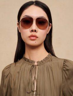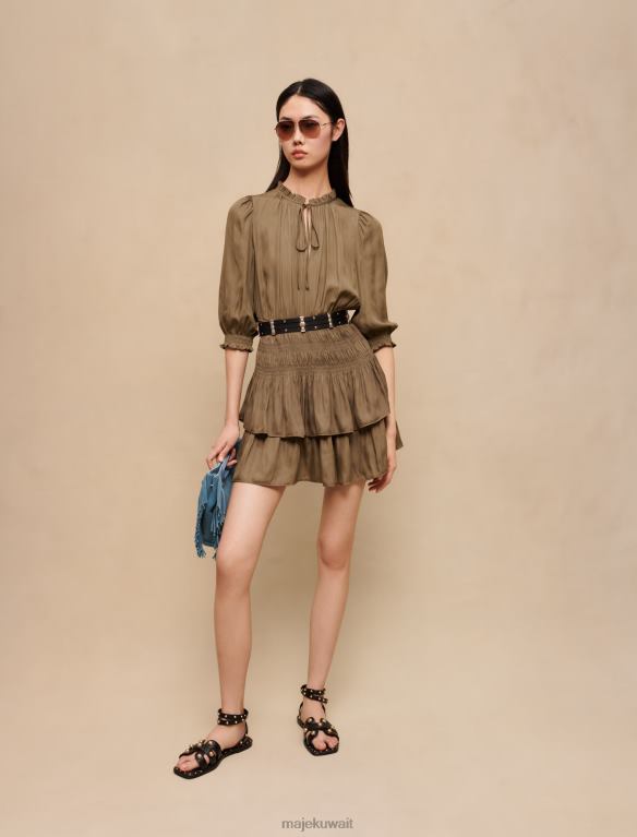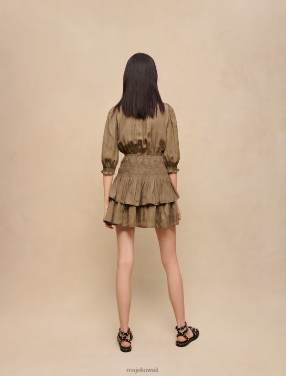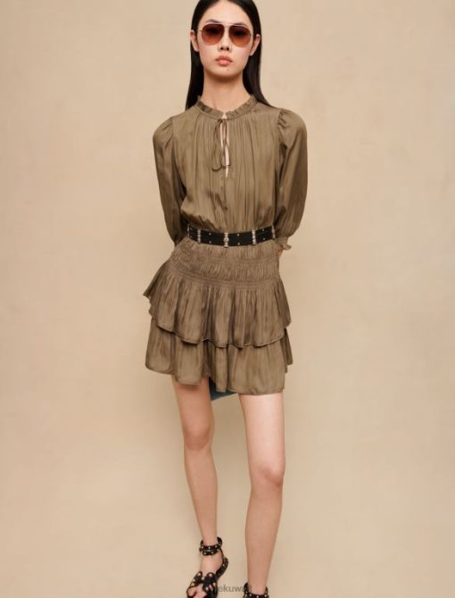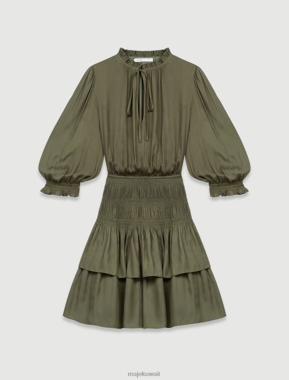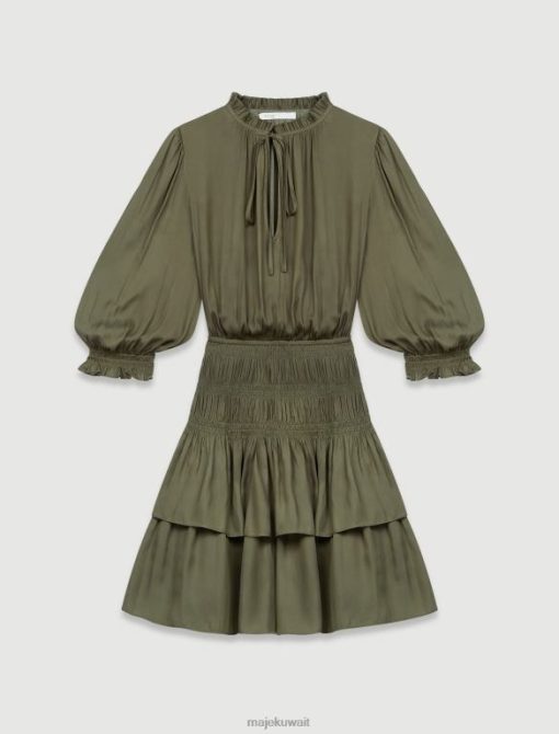 Maje فستان من الساتان مع دخان وكشكشة ملابس الكاكي نحيف JP08B126
