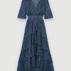 فستان طويل غير متماثل مع كشكشة. أكمام قصيرة فضفاضة. مبطن بالكامل بالفسكوز على الصدر والتنورة. العنق. دخان عند الخصر.