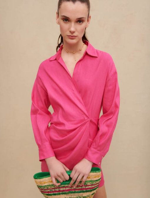يتميز هذا الفستان الملفوف بجزء غير متماثل عند الخصر، وياقة ملفوفة، وأكمام طويلة مع أساور بأزرار لمظهر أنيق وخفيف الوزن. ويمكن ارتداؤه مع الصنادل للمناسبات الخاصة.