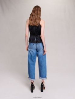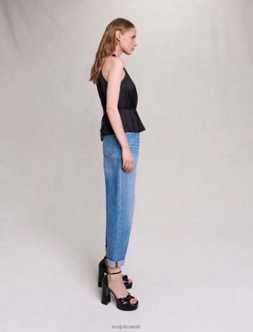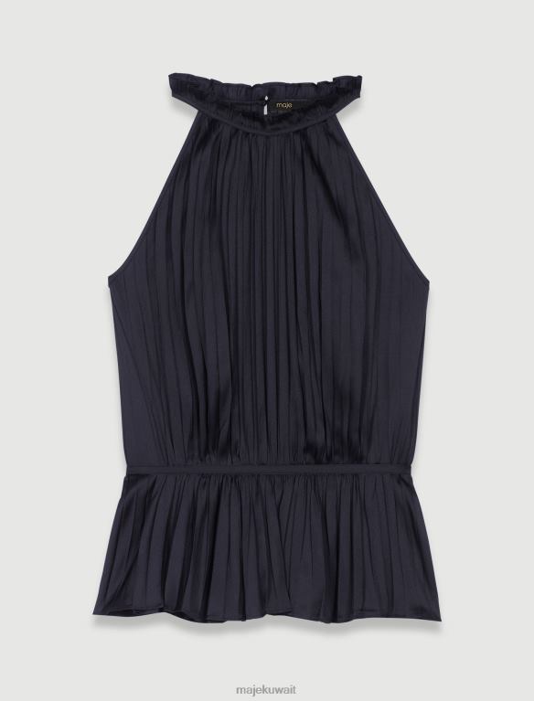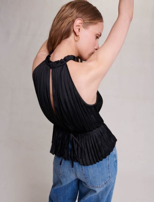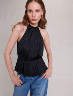 Maje قمة الساتان مطوي ملابس أسود نحيف JP08B82
